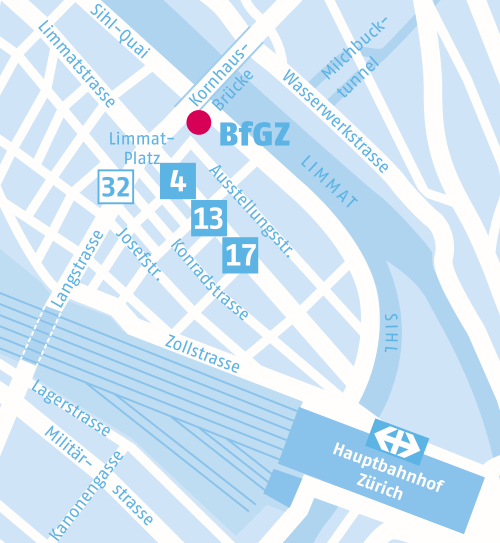 Ab Hauptbahnhof Zürich Tram Nr. 4 (Richtung Bahnhof Altstetten Nord), Nr. 13 (Richtung Frankental) oder Nr. 17 (Richtung Werdhölzli) bis «Limmatplatz» benützen. Die Berufsschule für Gestaltung Zürich ist in einer Minute ab «Limmatplatz» zu Fuss erreichbar.